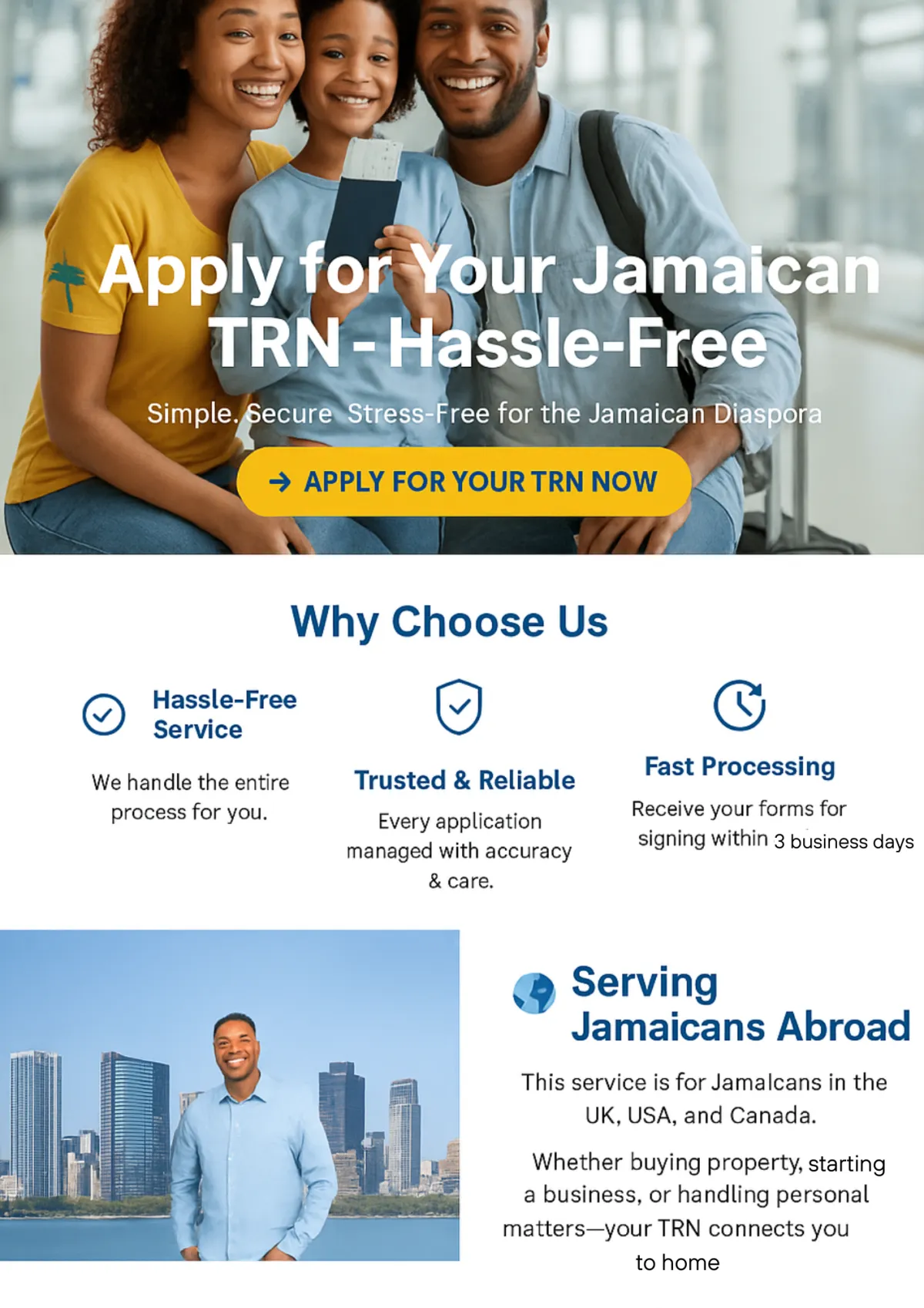 That insight led to the creation of Apply for TRN Jamaica: a safe, reliable service designed especially for Jamaicans abroad who want to confidently take their first step in conducting business back home.